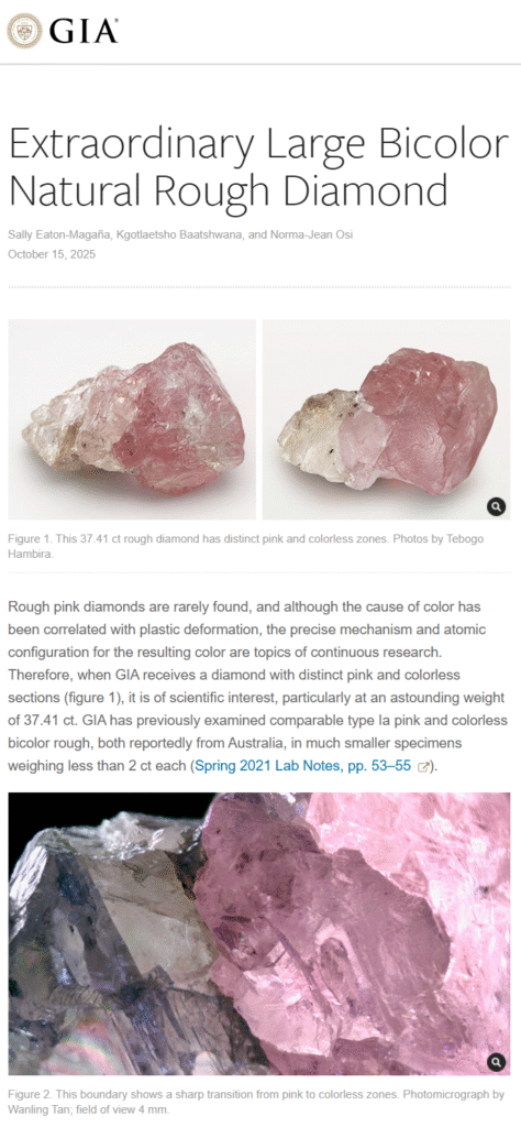 GABORONE, BOTSWANA — The GIA laboratory in Botswana recently examined an extraordinary 37.41-carat pink-and-colorless rough diamond, reportedly from the Karowe mine — the same source that produced the ginormous 2,488-carat (brownish) Motswedi diamond.