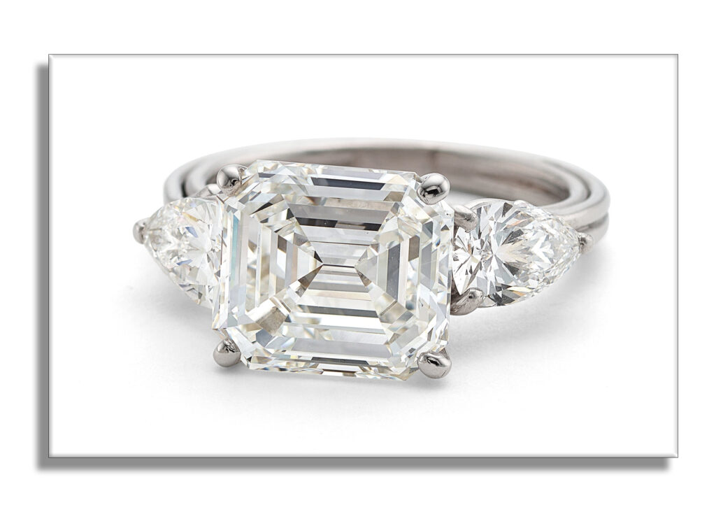 Next up, a Diamond and Platinum Ring, featuring an Emerald-cut diamond weighing 4.41 carats, graded E, Internally Flawless by GIA, accented by two pear shape diamonds weighing a total of approximately 1.00 carat, and graded D-E-F, Internally Flawless