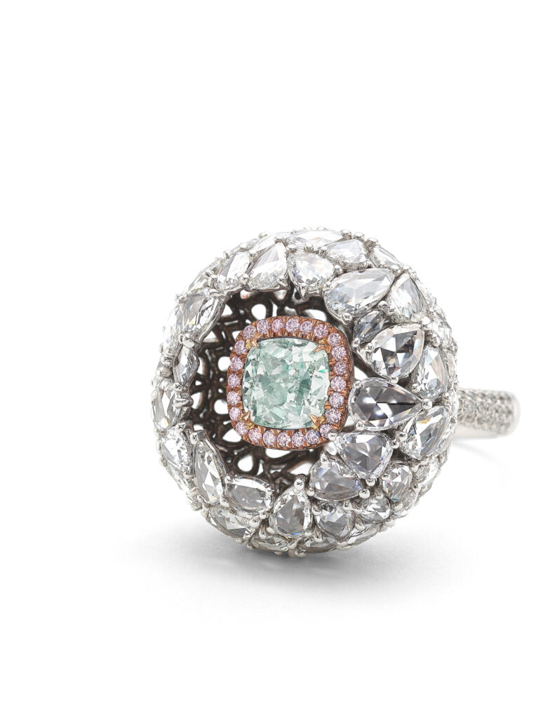 “This architectural ring centers a cushion-cut Fancy Light Bluish Green diamond, prong-set in rose gold and framed by a halo of pink diamonds.”