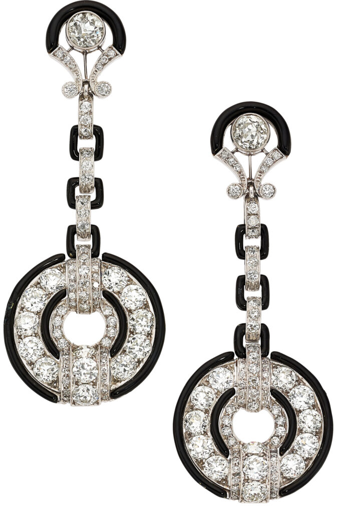 Here we see Old European-cut diamonds, weighing a total of approximately 12.20 carats, along with single-cut diamonds, weighing a total of approximately 0.30 carat, in Art Deco dangle earrings, with black enamel, all set in platinum with gold accents.