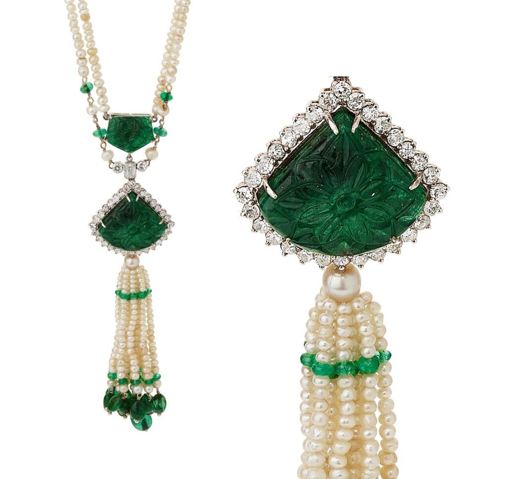 “A masterwork of old-world opulence! Curiously, the drop portion just below the largest emerald carving has been affixed by tying cord to a segment of the under gallery. The tassel is capped with a prominently placed pearl measuring 5.52 x 5.41 mm, the only one tested by GIA and confirmed to be of natural origin.