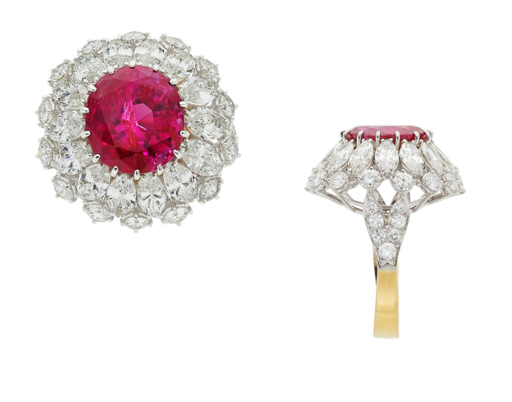 Well, size may also factor in to this one as well as color…. Here we have an oval-shaped Burma, no heat, ruby weighing 9.87 carats. The ruby is accented by marquises and round brilliant-cut diamonds, weighing a total of approximately 5.45 carats.