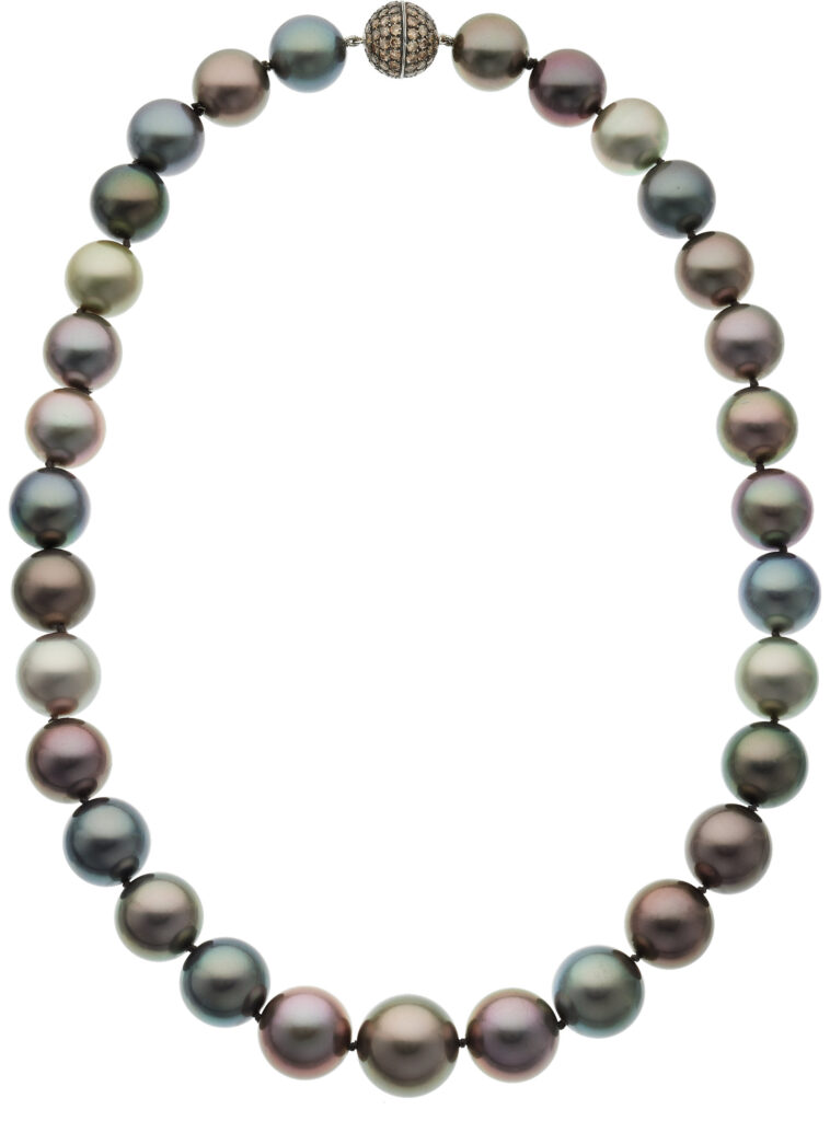 “The pearls in this strand exhibit a rich and varied palette, characteristic of Tahitian pearls, renowned for their naturally dark body colors and enticing overtones. The strand showcases body colors ranging from deep charcoal gray and steel to light silver-gray, with several pearls revealing bronze, aubergine, and greenish-black tones. A few pearls display less common hues, such as pistachio green and rosé-tinted gray, adding to the strand’s visual complexity.”