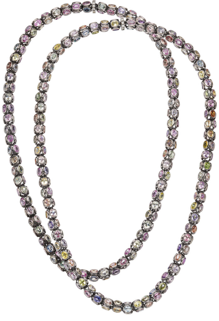 “Color takes the lead in this two-piece necklace set, composed of bezel-set, oval-shaped sapphires in a wide range of hues. Measuring 19 inches and 20 inches respectively, the necklaces are fitted with precision clasps that allow them to connect seamlessly into a single, continuous strand measuring approximately 40 inches. The combined necklace offers versatile styling, worn long, doubled, or layered, without visible breaks or mismatches between the two sections.”