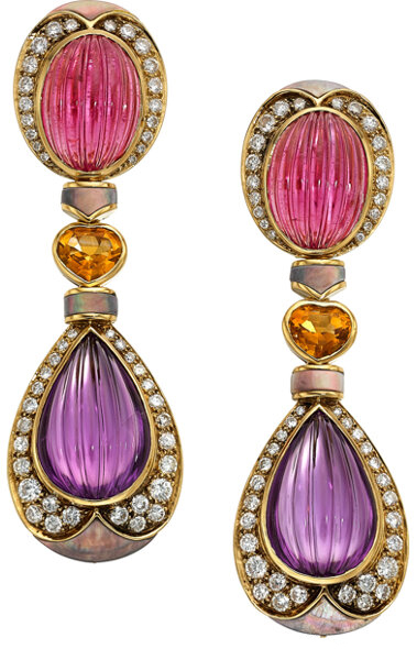 The gemstones are carved amethysts and pink tourmalines. There are heart-shaped citrines and full-cut diamonds (weighing approximately 3.25 carats), along with carved mother-of-pearl.
