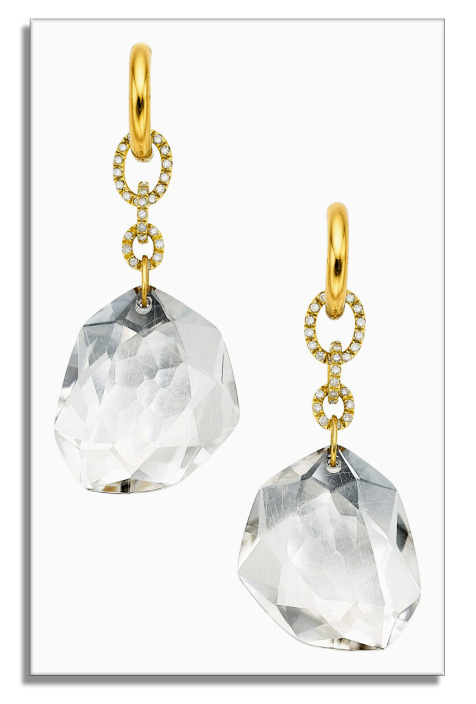 H Stern is known for taking available Brazilian gem materials, like rock crystal quartz, cutting them in an artful manner – unique from the traditional style, setting them with diamonds in yellow gold, and creating something note-worthy. And these earrings are just that. Set with just under a carat of diamonds, these rock crystal quartz earrings sold for $10,000!