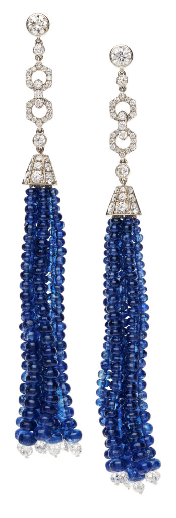 Fine quality Sapphire beads, accented up top by full-cut round brilliant diamonds weighing a total of approximately 2.20 carats, and below, faceted diamond beads – LOVE the look! The quality of the sapphire beads make all the difference.