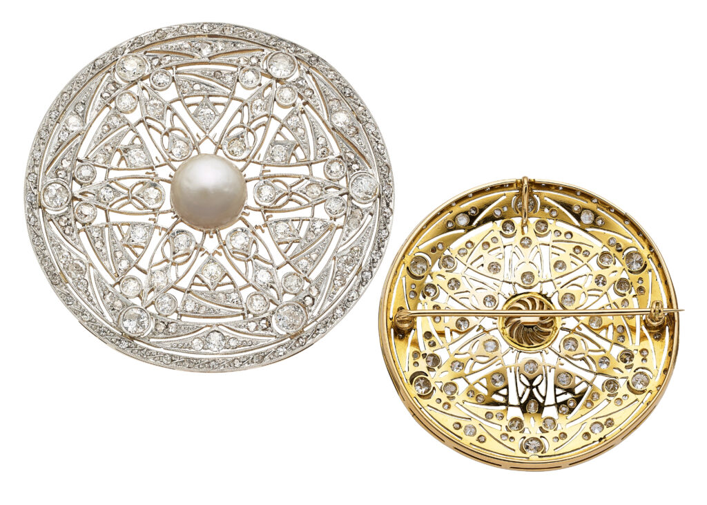 “The design showcases the geometric sophistication of the period, highlighted by brilliant diamonds and detailed enamel work. … A striking and authentic representation of early 20th-century craftsmanship.”