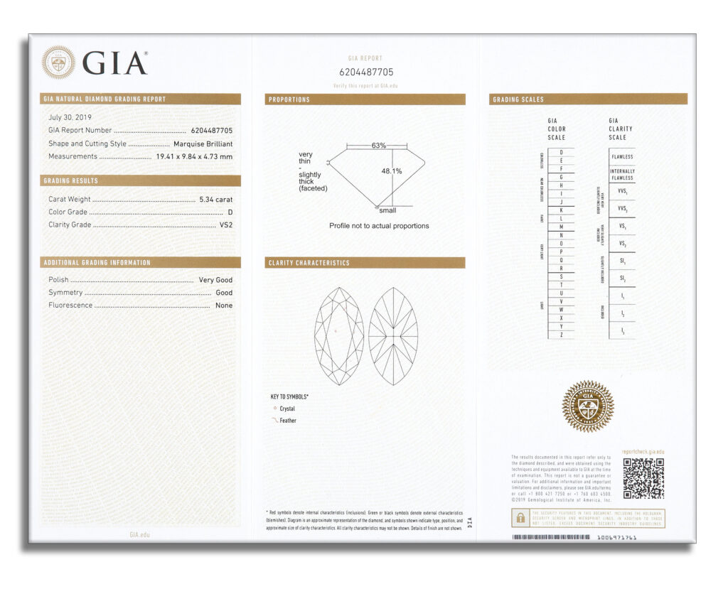“Graded D color, the center stone sits at the top of the GIA scale, signifying a complete absence of body color, a distinction especially notable in a diamond of this size. Clarity characteristics include a low-relief feather on one crown facet and a crystal near the center, both internal and not visible without magnification.”