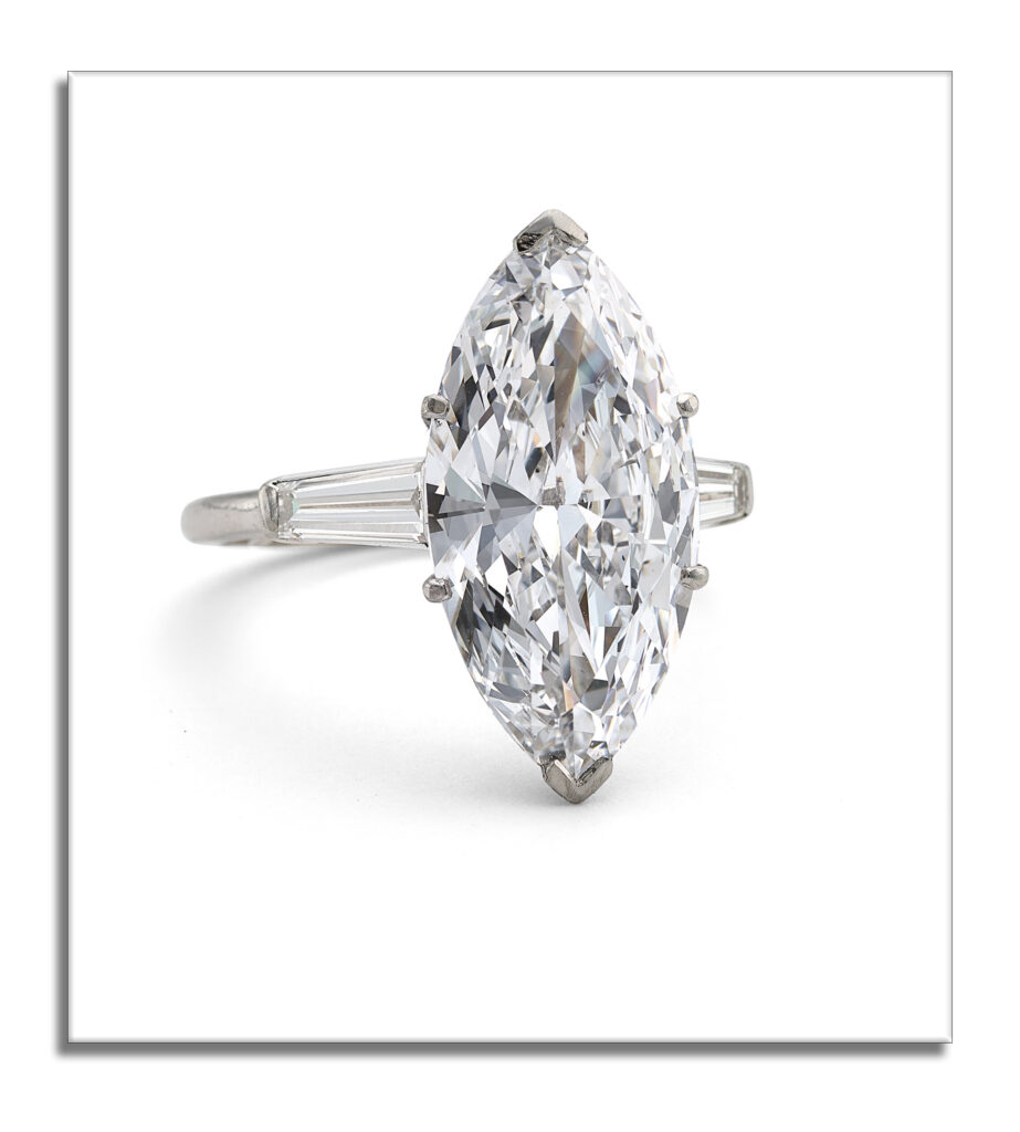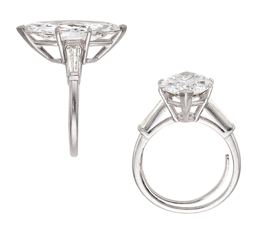 Stones: Marquise-shaped diamond weighing 5.34 carats; tapered baguette-cut diamonds