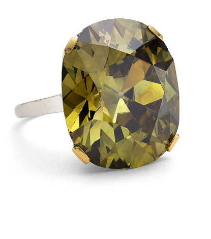 Here we have a cushion-shaped fancy colored diamond, weighing 41.54 carats. The ring does not matter… it’s just a place-holder.