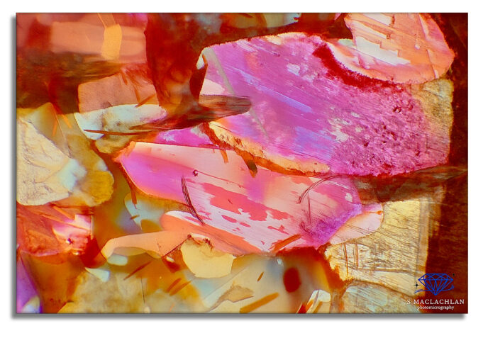 This time, we have a series of platelets in this Tanzanian sunstone, reminiscent of a watercolour painting. This image is taken in diffused and oblique lighting with a magnification of 100x and is a stack of 18 images.