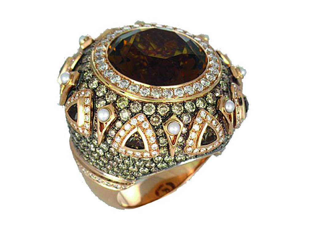 Cognac quartz set in a domed structure of 18kt rose gold, with full pavé of brown diamonds, white diamonds, and pearls.