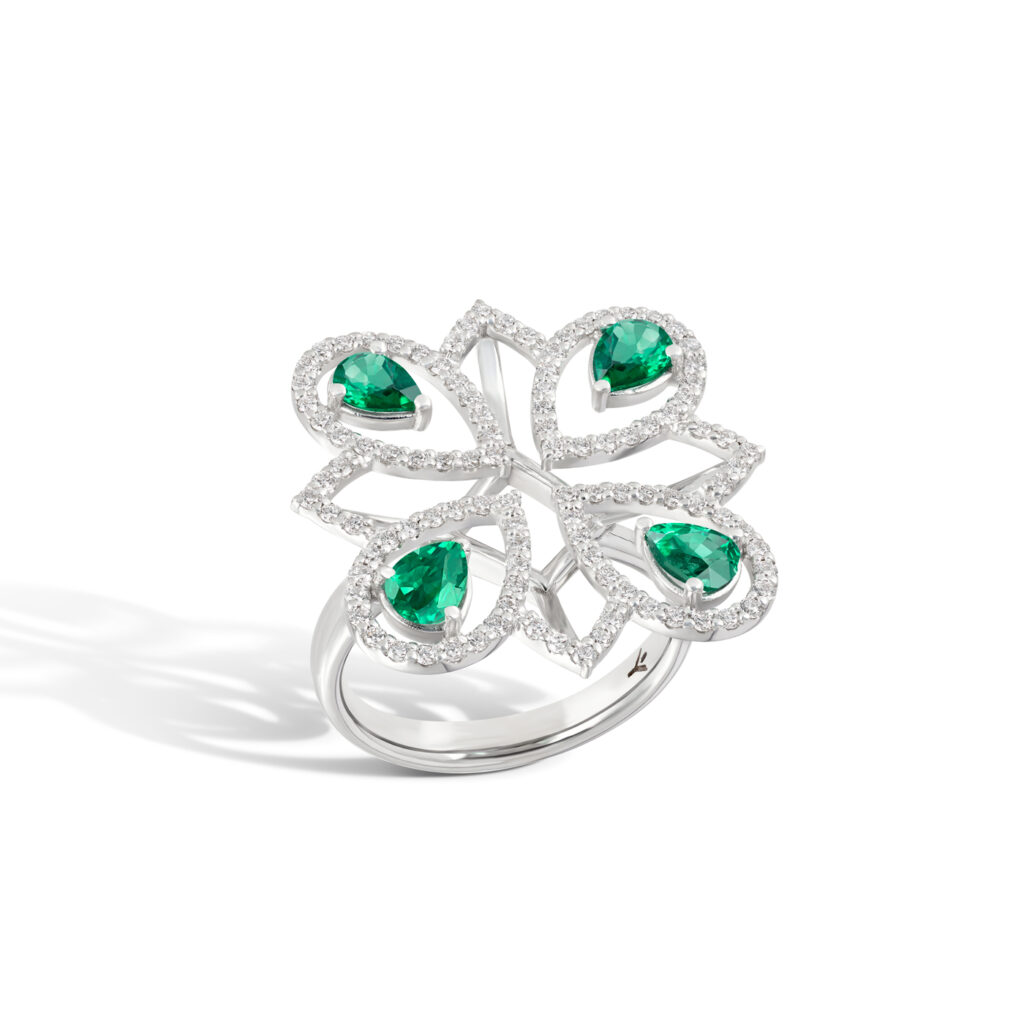 It is crafted in 18kt gold, available in white, rose, or yellow gold, and adorned with natural diamonds and pear-shaped emeralds.